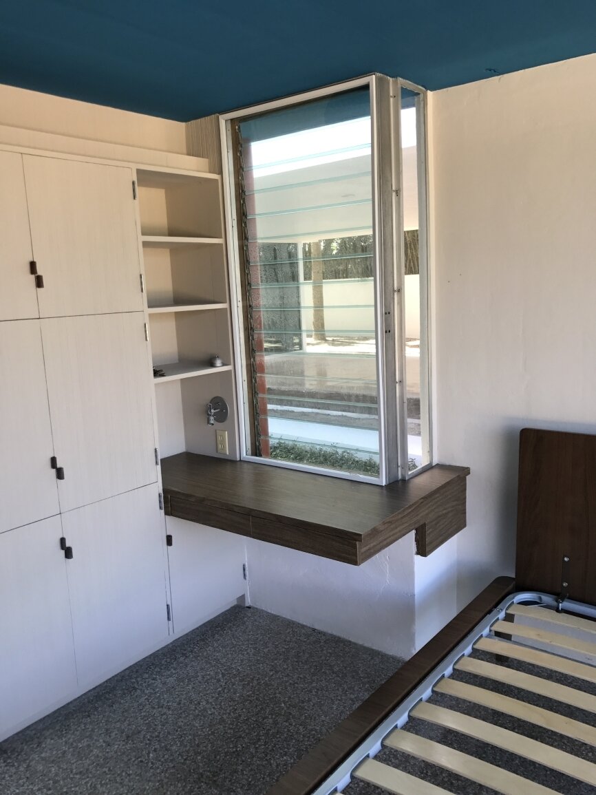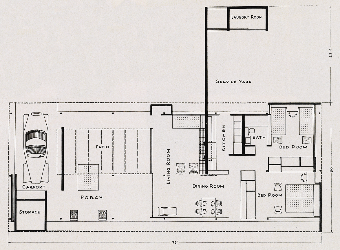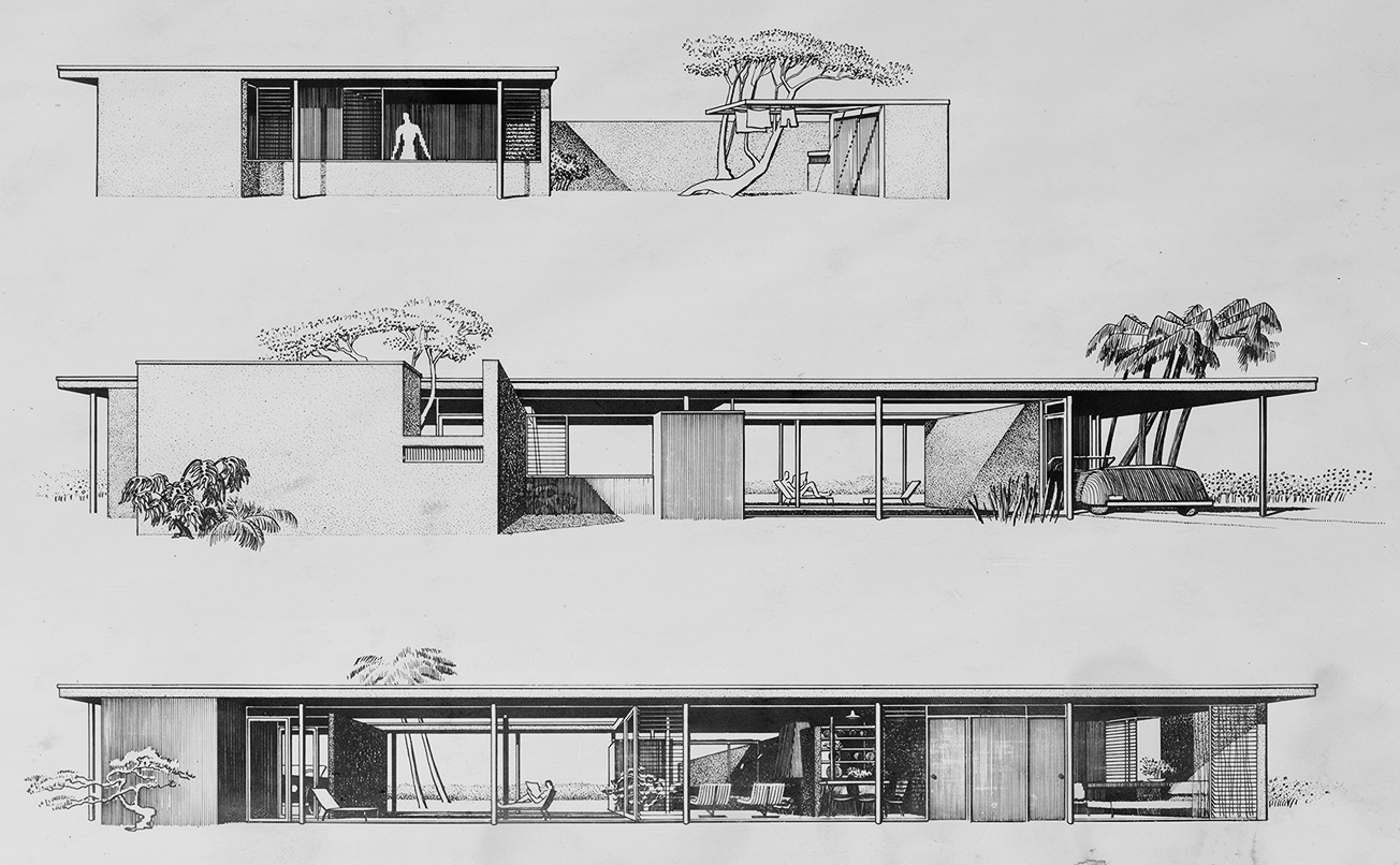 In 1948, Rudolph designs the home and drafts all of the construction documents. The design illustrates how copper could be used in residential design and is part of an innovative program to meet the housing needs of returning World War II veterans.