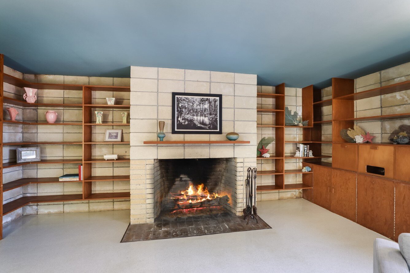 The Ocala block fireplace and accent walls ground the design in its natural surroundings.