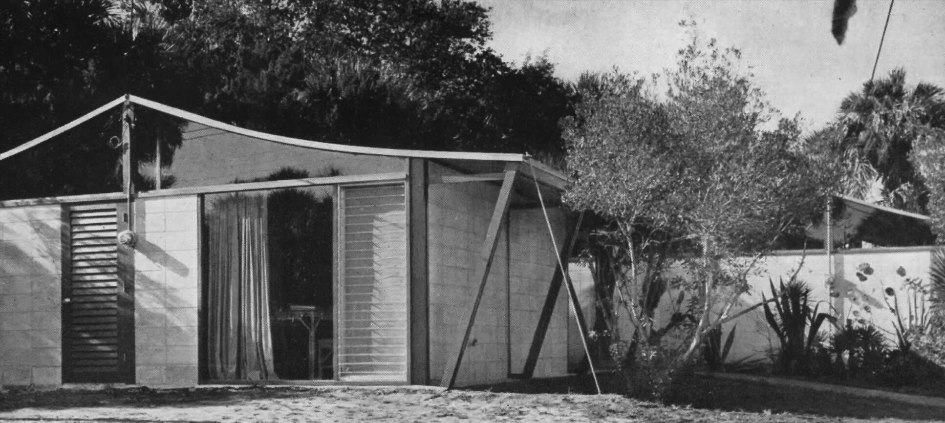 “In comparison to the Coward Residence, the Kate Wheelan Cottage conveys a more pronounced sense of abstraction in the disposition of form and material. Planar block walls of uniform height anchor the two cottages to the ground and to each other. Through the use of open side walls and glazed gable ends, the thin swooping roof reads as an independent form, seeming to float in air. The broad, sheltering quality of the roof is further emphasized in the interior. Freestanding partitions, except at the bathroom enclosure, continue at the same height as the block walls, independent of the hovering canopy above.