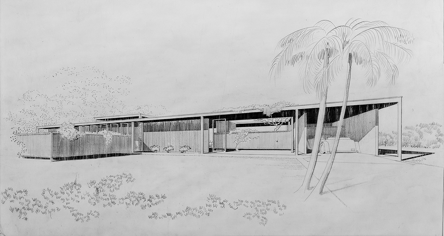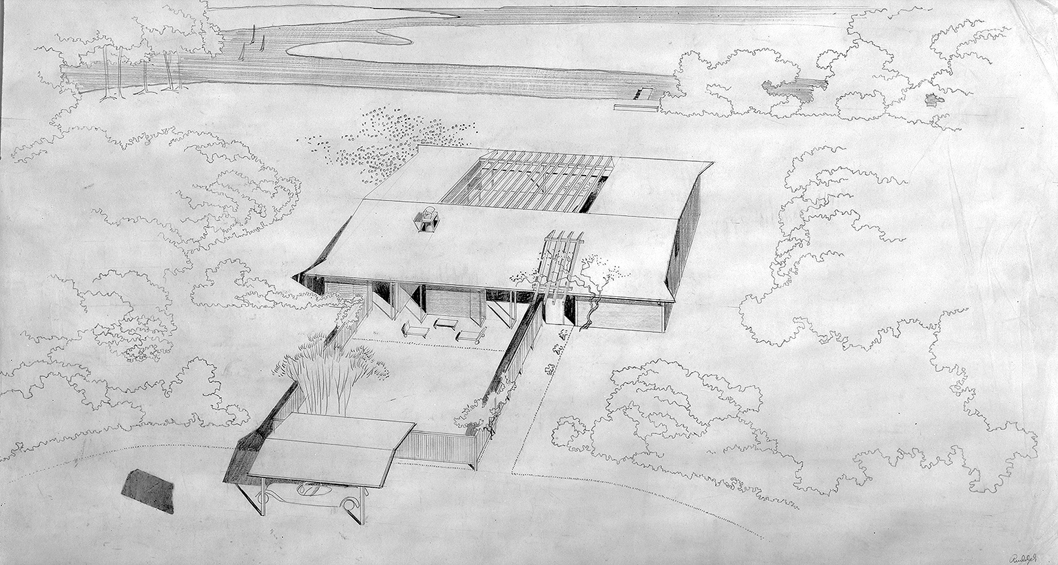 Rudolph originally provides the client with two proposals, from which the house with a pitched-roof is chosen.
