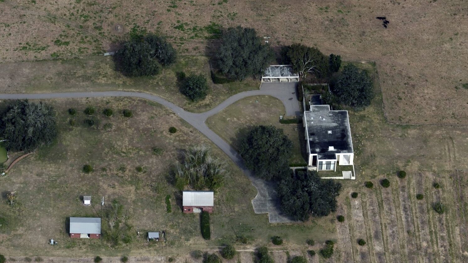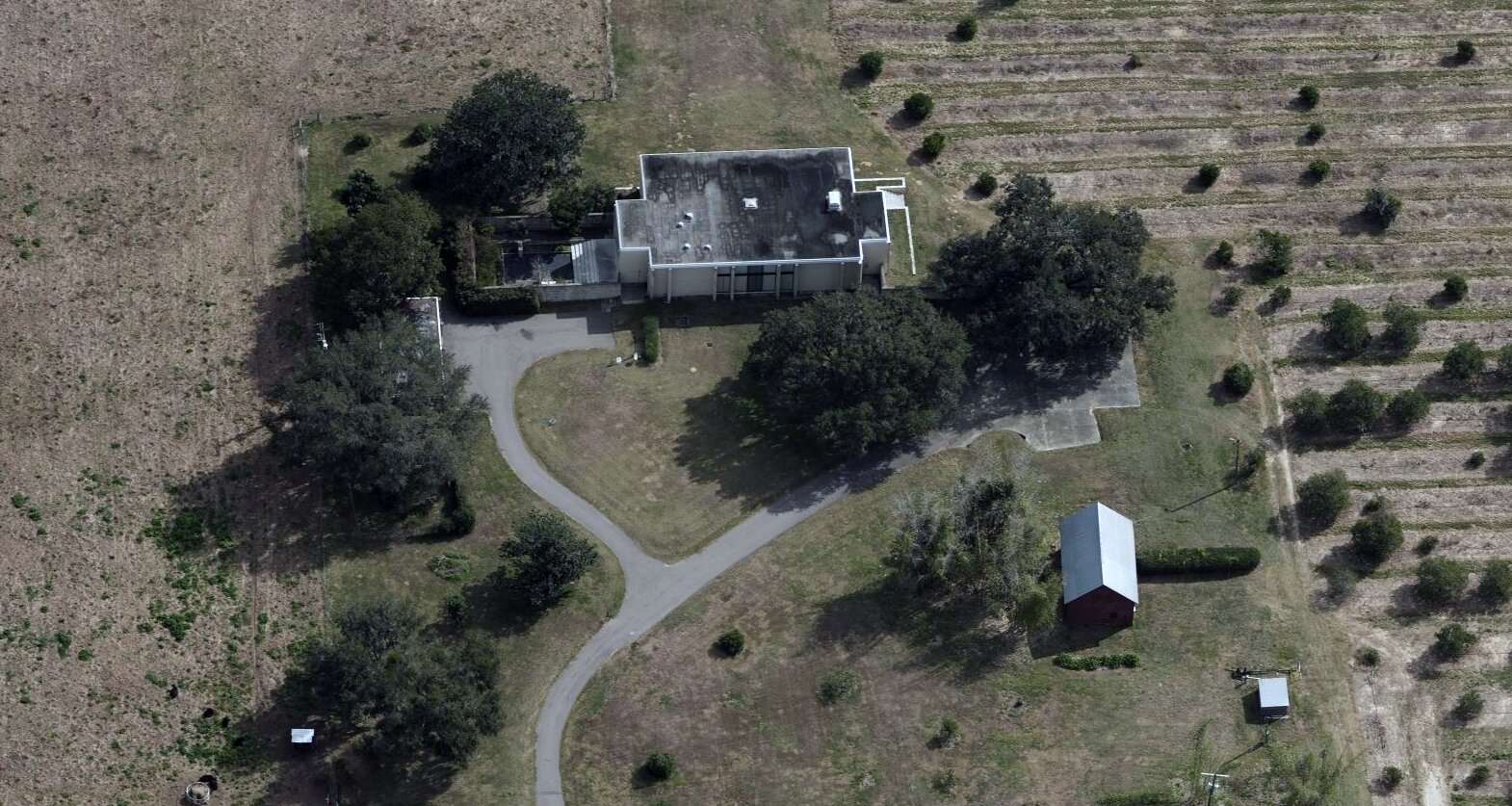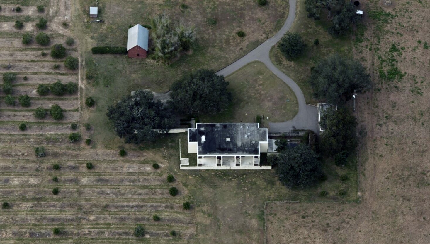 The site of the residence is the focal point of a 30-year old orchard of 35-ft high orange trees, with a 1000’ (304.8 m) central allée opened up to a lake. The residence is placed on axis approximately 25’-0” above the lake. A podium terrace dramatizes the importance of the house. The lack of ordinary fenestration and openings offer no scale and makes the house appear larger than it is.