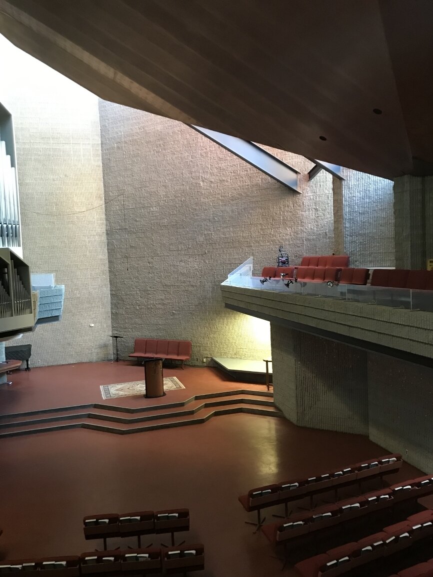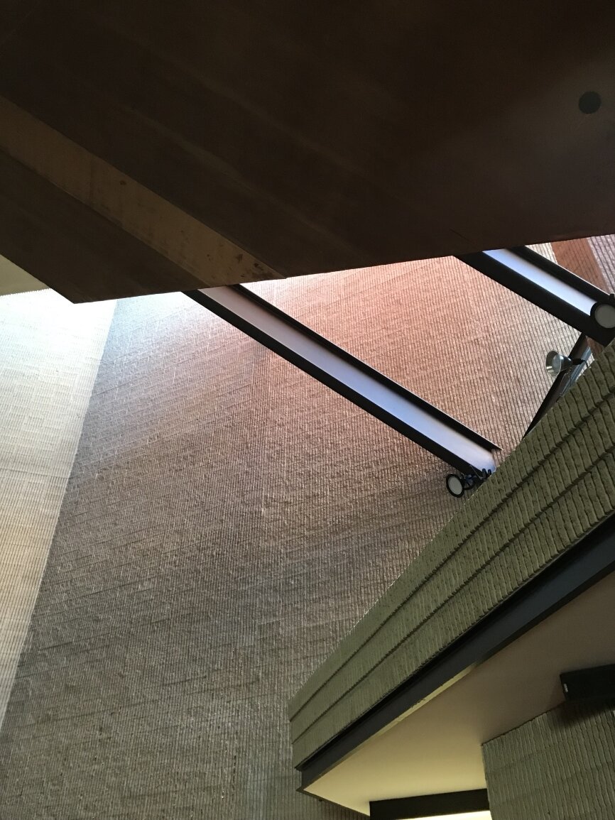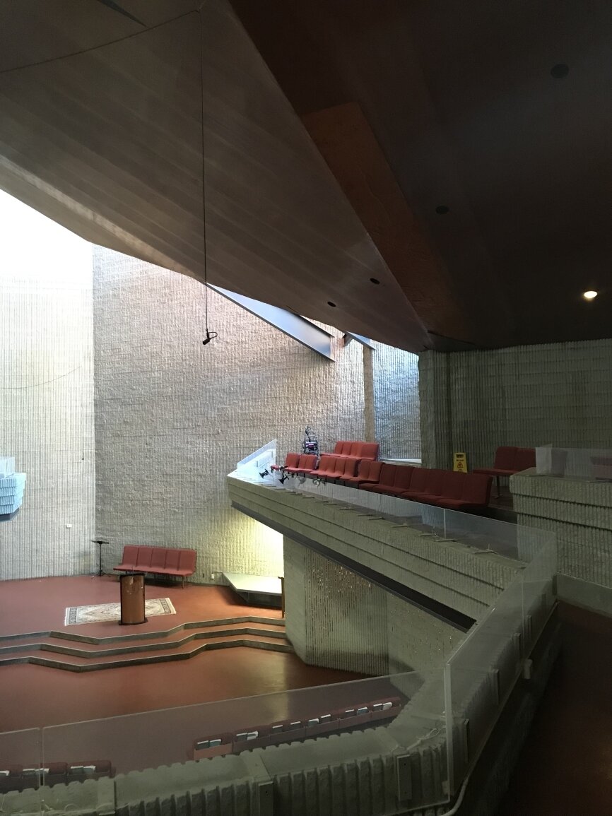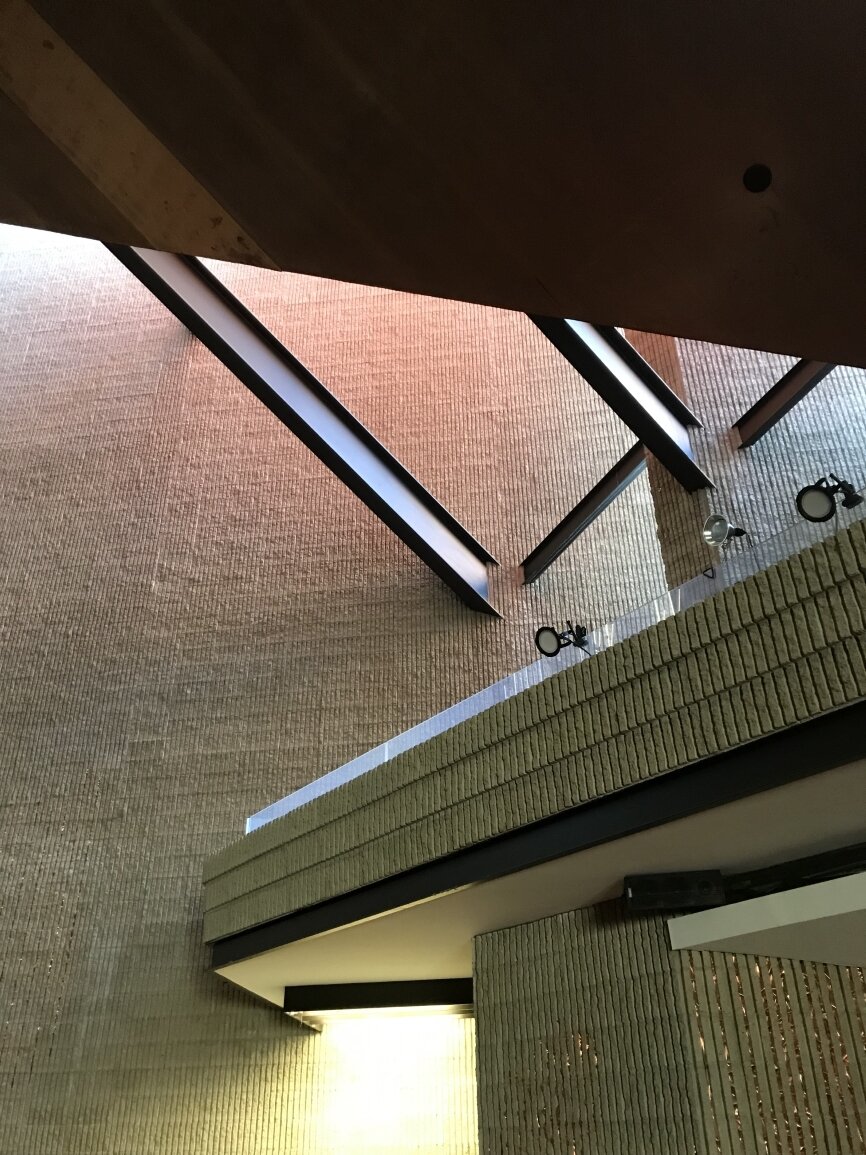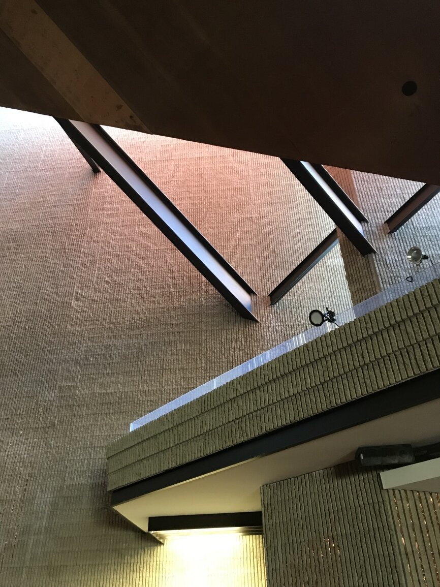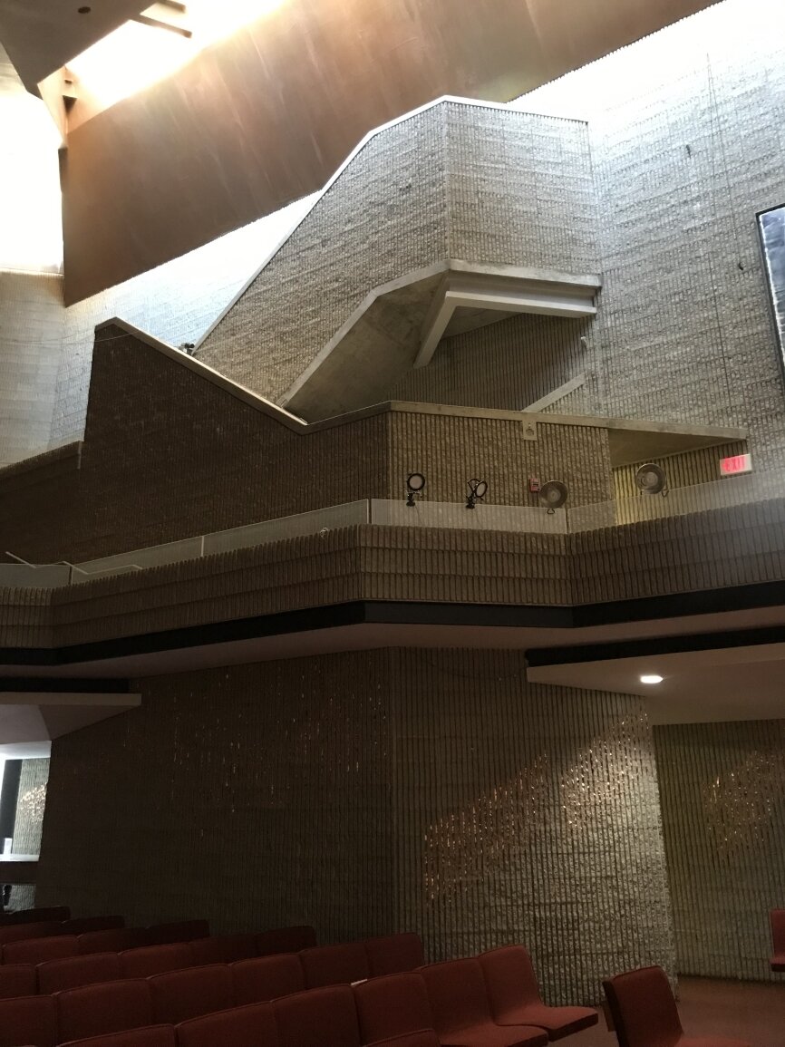 Paul Rudolph incorporated the remains of the local ‘puddingstone’ tower, steeple and facade of the original 1868 Ware & van Brunt building to serve as the East walls of the new building. The charred wood frame of the original rose window opening was left to serve as a reminder of the 1968 fire.