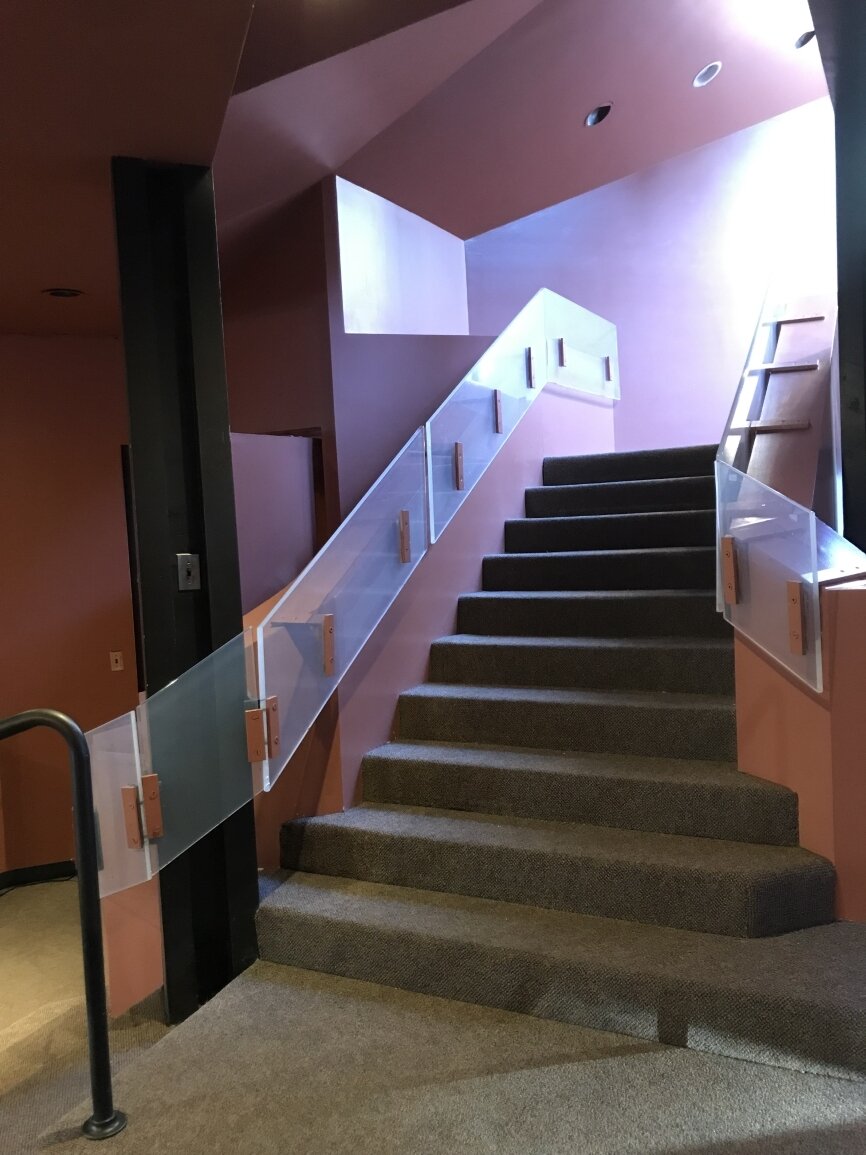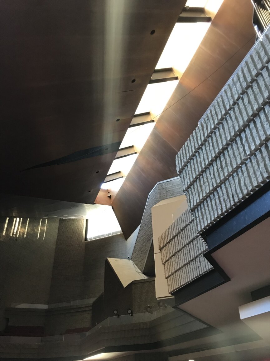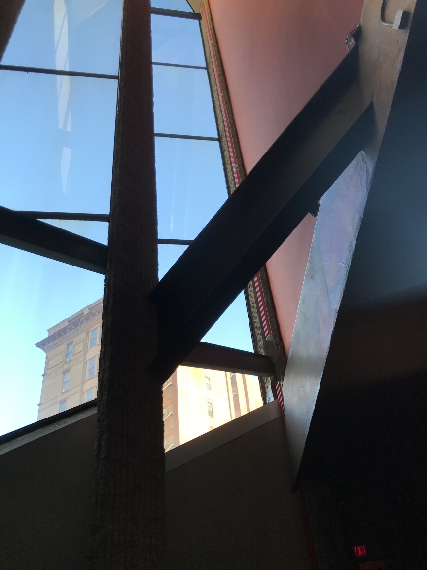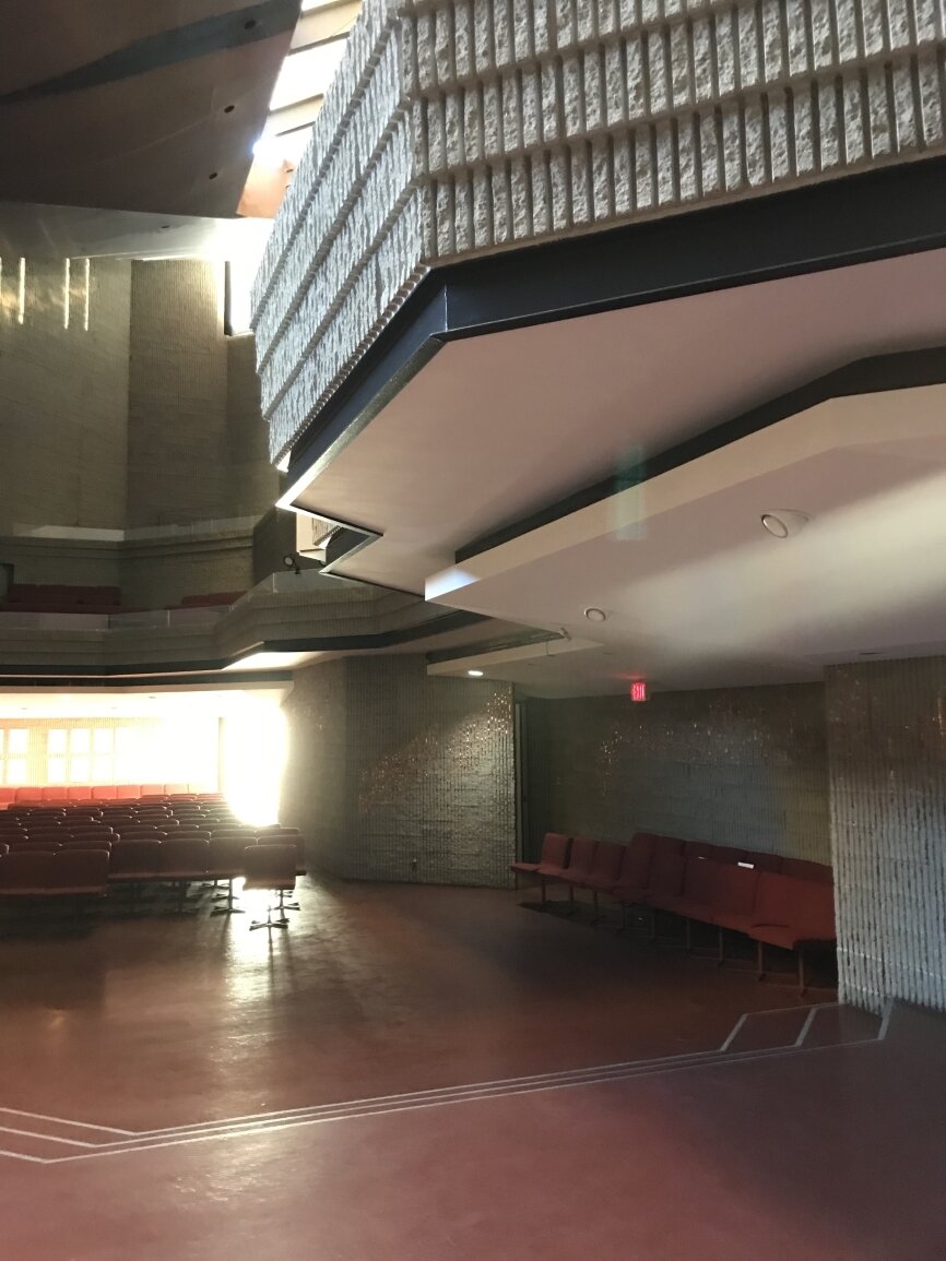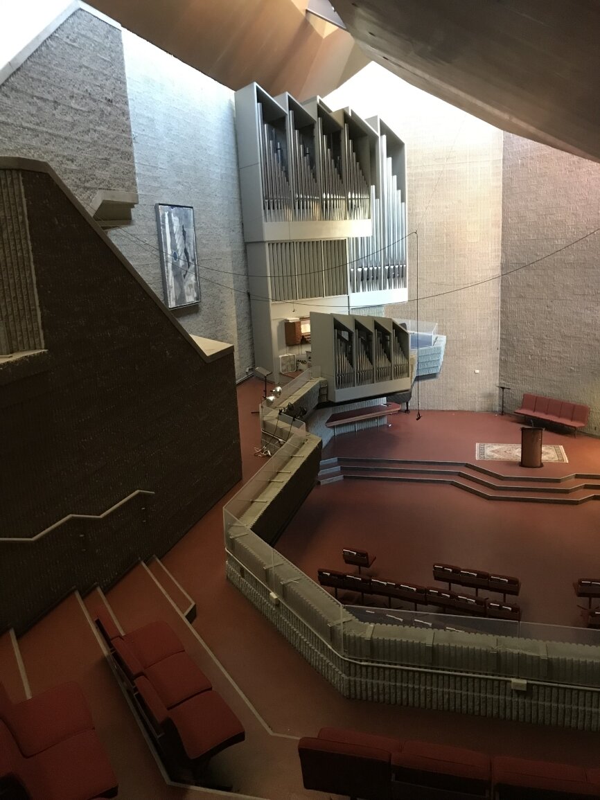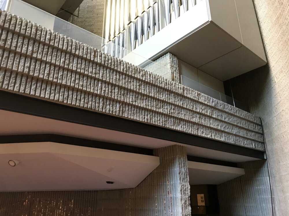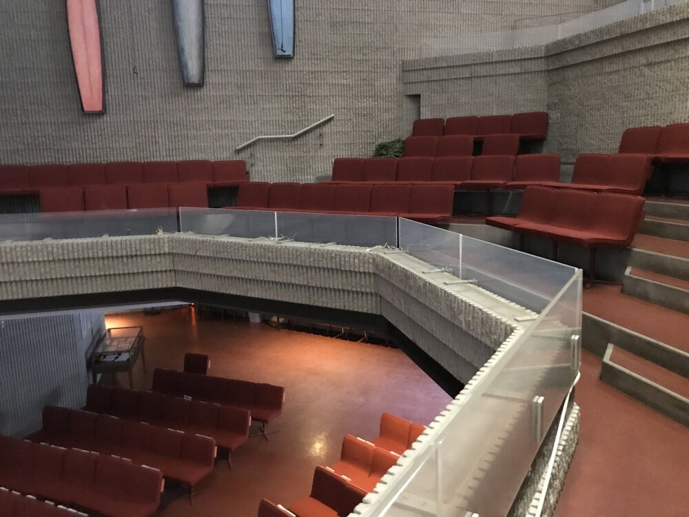 Paul Rudolph incorporated the remains of the local ‘puddingstone’ tower, steeple and facade of the original 1868 Ware & van Brunt building to serve as the East walls of the new building. The charred wood frame of the original rose window opening was left to serve as a reminder of the 1968 fire.