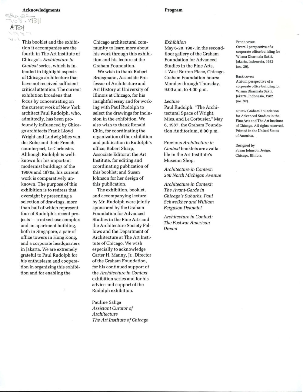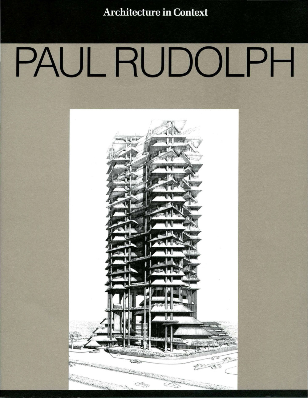 “… a proposed exhibition of drawings by Mr. Rudolph in the "Architecture in Context" series. The initial concept for the show, which was scheduled to open in the fall of 1986 at the Graham Foundation for Advanced Studies in the Fine Arts in Chicago, was to show how the work of Mr. Rudolph was related to the work of Frank Lloyd Wright. The idea was to exhibit drawings of the Art and Architecture Building at Yale University and to produce a short catalogue written by myself that would explain the links between Wright and Rudolph. After some exploratory research and a visit to the office of Mr. Rudolph on February 10, 1986, it became apparent that such a show might not be advisable. The Art and Architecture Building drawings had already been extensively published and commented on in a number of periodicals over the years, notably in a special issue of Perspecta, and it became clear that not only the Art and Architecture Building but all of the architect's work was indebted to Wright to some degree. Instead, an agreement was reached that the show would consist of two parts: one a small retrospective of Mr. Rudolph's work throughout his career, perhaps with special attention to the Christian Science Organization Building at the University of Illinois at Urbana, then under threat of demolition, and the other part would be a selection of drawings of work then underway in Southeast Asia.”