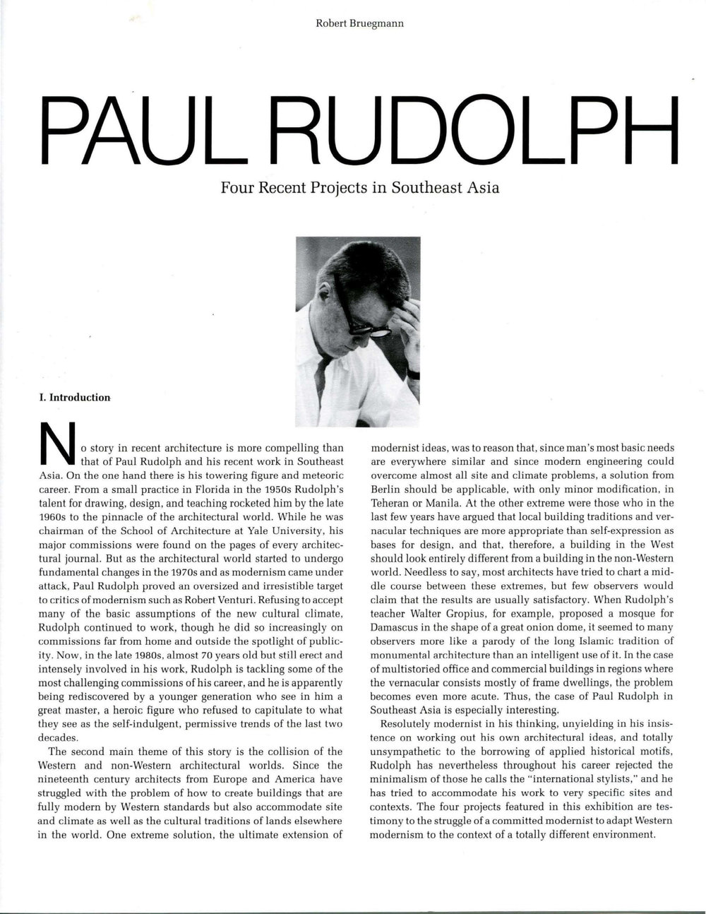 Resolutely modernist in his thinking, unyielding in his insistence on working out his own architectural ideas, and totally unsympathetic to the borrowing of applied historical motifs, Rudolph has nevertheless throughout his career rejected the minimalism of those he calls the "international stylists, " and he has tried to accommodate his work to very specific sites and contexts. The four projects featured in this exhibition are testimony to the struggle of a committed modernist to adapt Western modernism to the context of a totally different environment.