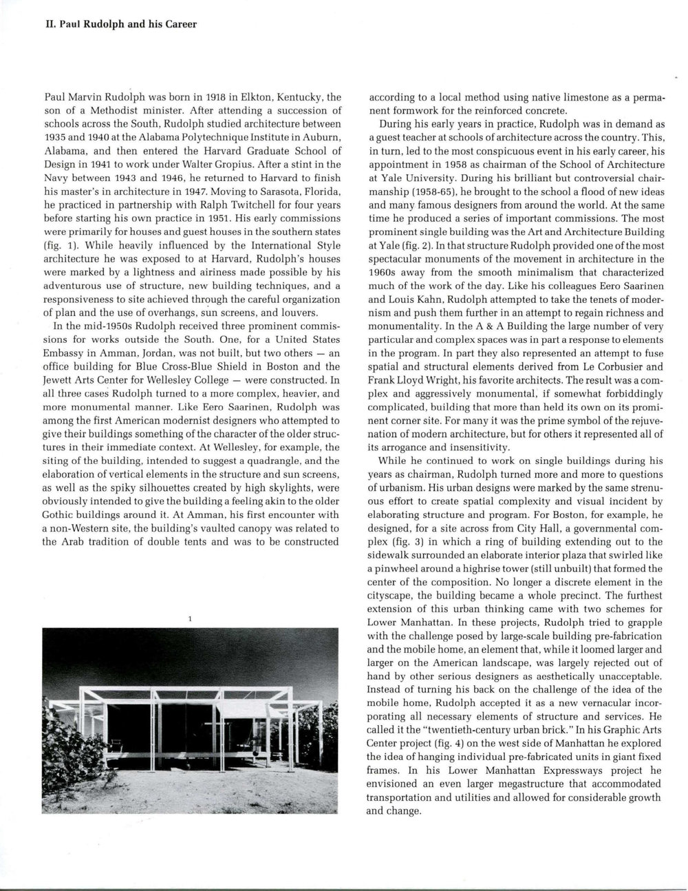 Paul Marvin Rudolph was born in 1918 in Elkton, Kentucky, the son of a Methodist minister. After attending a succession of schools across the South, Rudolph studied architecture between 1935 and 1940 at the Alabama Polytechnique Institute in Auburn, Alabama, and then entered the Harvard Graduate School of Design in 1941 to work under Walter Gropius. After a stint in the Navy between 1943 and 1946, he returned to Harvard to finish his master's in architecture in 1947. Moving to Sarasota, Florida, he practiced in partnership with Ralph Twitchell for four years before starting his own practice in 1951. His early commissions were primarily for houses and guest houses in the southern states (fig. 1). While heavily influenced by the International Style architecture he was exposed to at Harvard, Rudolph's houses were marked by a lightness and airiness made possible by his adventurous use of structure, new building techniques, and a responsiveness to site achieved through the careful organization of plan and the use of overhangs, sun screens, and louvers.