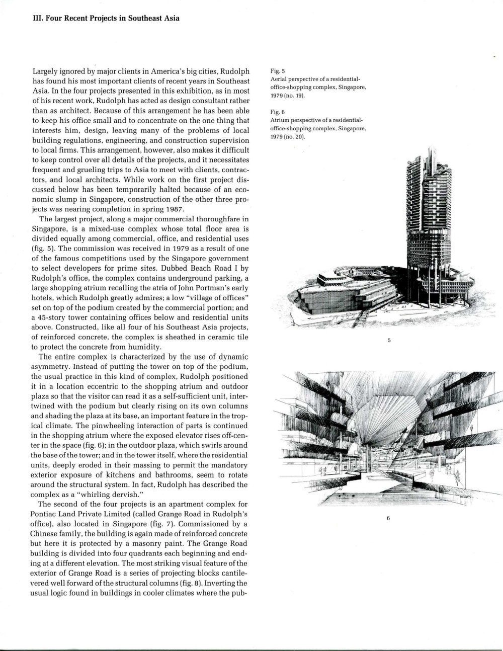 The largest project, along a major commercial thoroughfare in Singapore, is a mixed-use complex whose total floor area is divided equally among commercial, office, and residential uses (fig. 5). The commission was received in 1979 as a result of one of the famous competitions used by the Singapore government to select developers for prime sites. Dubbed Beach Road I by Rudolph's office, the complex contains underground parking, a large shopping atrium recalling the atria of John Portman's early hotels, which Rudolph greatly admires; a low "village of offices " set on top of the podium created by the commercial portion; and a 45-story tower containing offices below and residential units above. Constructed , like all four of his Southeast Asia projects, of reinforced concrete, the complex is sheathed in ceramic tile to protect the concrete from humidity.