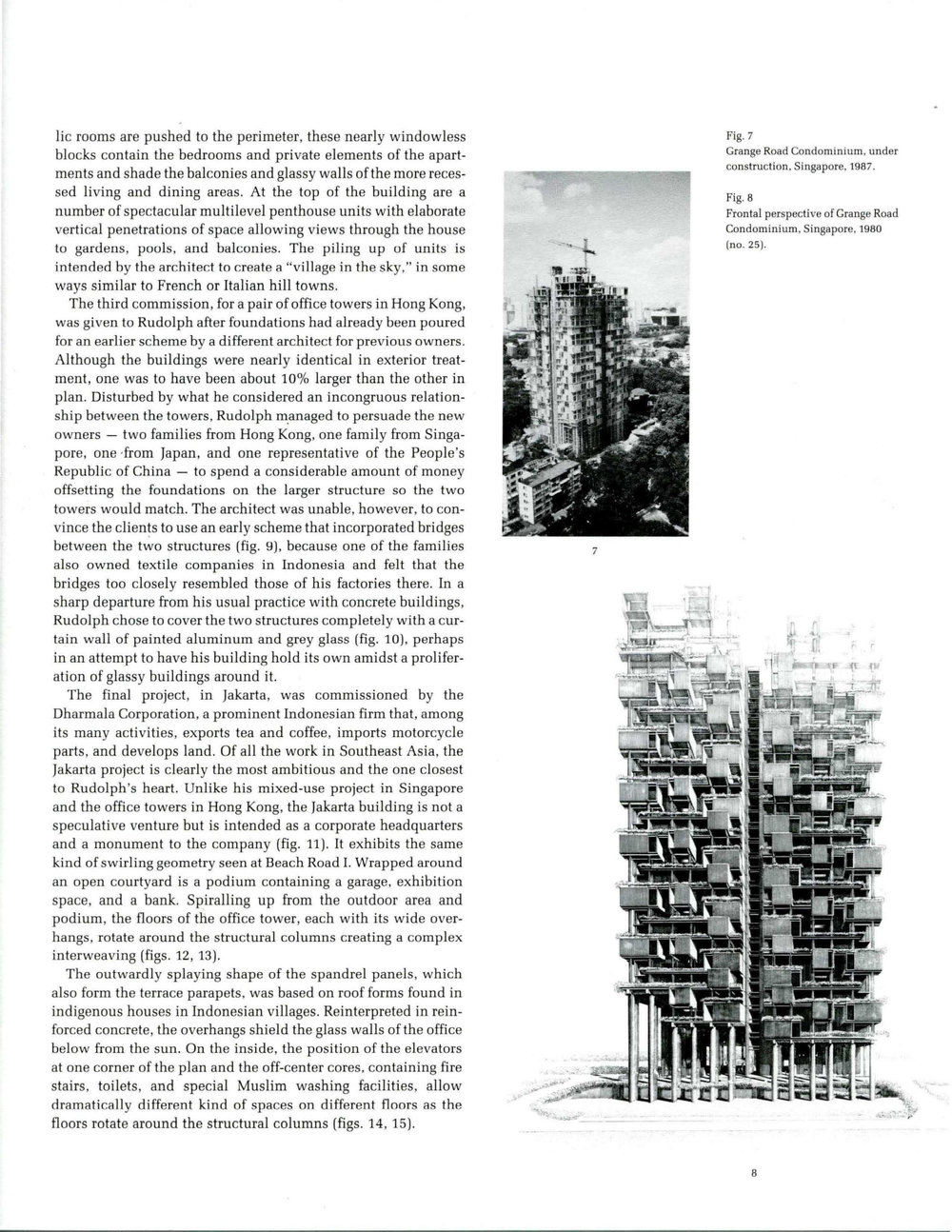 The second of the four projects is an apartment complex for Pontiac Land Private Limited (called Grange Road in Rudolph's office), also located in Singapore (fig. 7). Commissioned by a Chinese family, the building is again made of reinforced concrete but here it is protected by a masonry paint. The Grange Road building is divided into four quadrants each beginning and ending at a different elevation. The most striking visual feature of the exterior of Grange Road is a series of projecting blocks cantilevered well forward of the structural columns (fig. 8). Inverting the usual logic found in buildings in cooler climates where the pub-lie rooms are pushed to the perimeter, these nearly windowless blocks contain the bedrooms and private elements of the apartments and shade the balconies and glassy walls of the more recessed living and dining areas. At the top of the building are a number of spectacular multilevel penthouse units with elaborate vertical penetrations of space allowing views through the house to gardens, pools, and balconies. The piling up of units is intended by the architect to create a "village in the sky," in some ways similar to French or Italian hill towns.