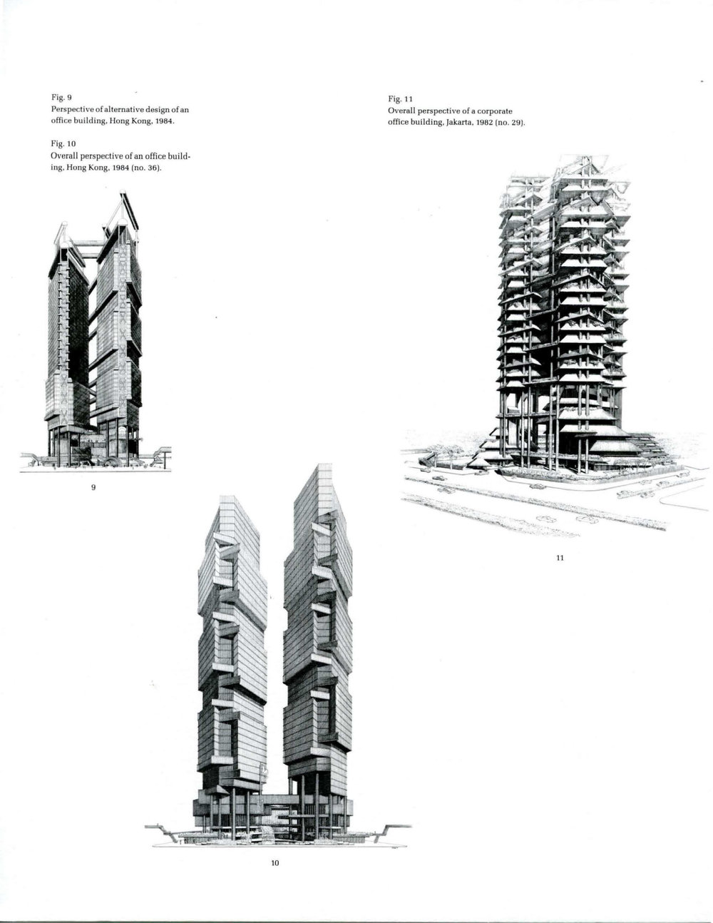 The third commission, for a pair of office towers in Hong Kong, was given to Rudolph after foundations had already been poured for an earlier scheme by a different architect for previous owners. Although the buildings were nearly identical in exterior treatment, one was to have been about 10% larger than the other in plan. Disturbed by what he considered an incongruous relationship between the towers, Rudolph managed to persuade the new owners - two families from Hong Kong, one family from Singapore, one ·from Japan, and one representative of the People's Republic of China - to spend a considerable amount of money offsetting the foundations on the larger structure so the two towers would match. The architect was unable, however, to convince the clients to use an early scheme that incorporated bridges between the two structures (fig. 9), because one of the families also owned textile companies in Indonesia and felt that the bridges too closely resembled those of his factories there. In a sharp departure from his usual practice with concrete buildings, Rudolph chose to cover the two structures completely with a curtain wall of painted aluminum and grey glass (fig. 10), perhaps in an attempt to have his building hold its own amidst a proliferation of glassy buildings around it.