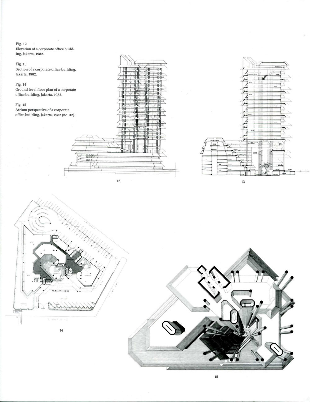 The final project, in Jakarta, was commissioned by the Dharmala Corporation, a prominent Indonesian firm that, among its many activities, exports tea and coffee, imports motorcycle parts, and develops land. Of all the work in Southeast Asia, the Jakarta project is clearly the most ambitious and the one closest to Rudolph's heart. Unlike his mixed-use project in Singapore and the office towers in Hong Kong, the Jakarta building is not a speculative venture but is intended as a corporate headquarters and a monument to the company (fig. 11). It exhibits the same kind of swirling geometry seen at Beach Road I. Wrapped around an open courtyard is a podium containing a garage, exhibition space, and a bank. Spiralling up from the outdoor area and podium, the floors of the office tower, each with its wide overhangs, rotate around the structural columns creating a complex interweaving (figs. 12, 13).