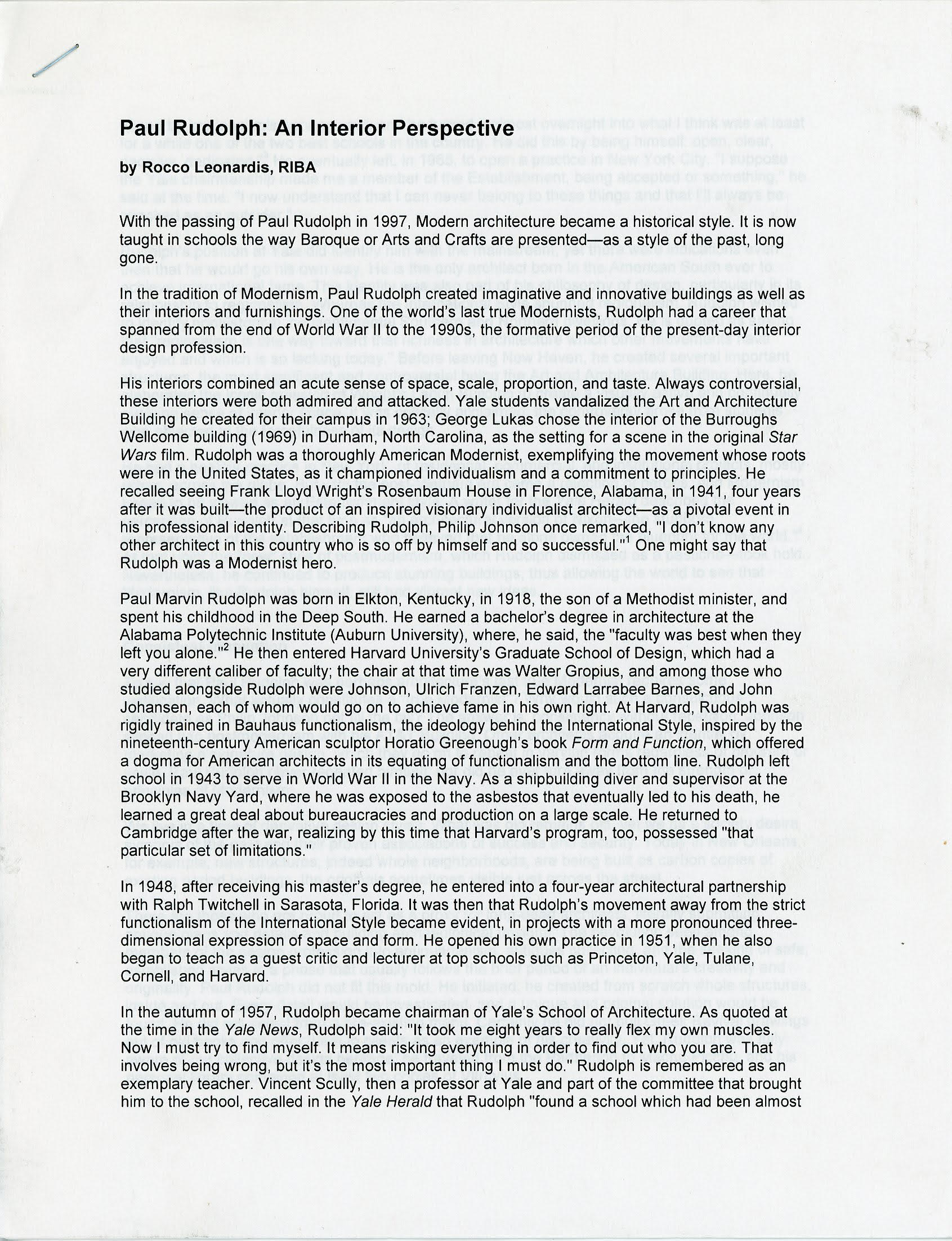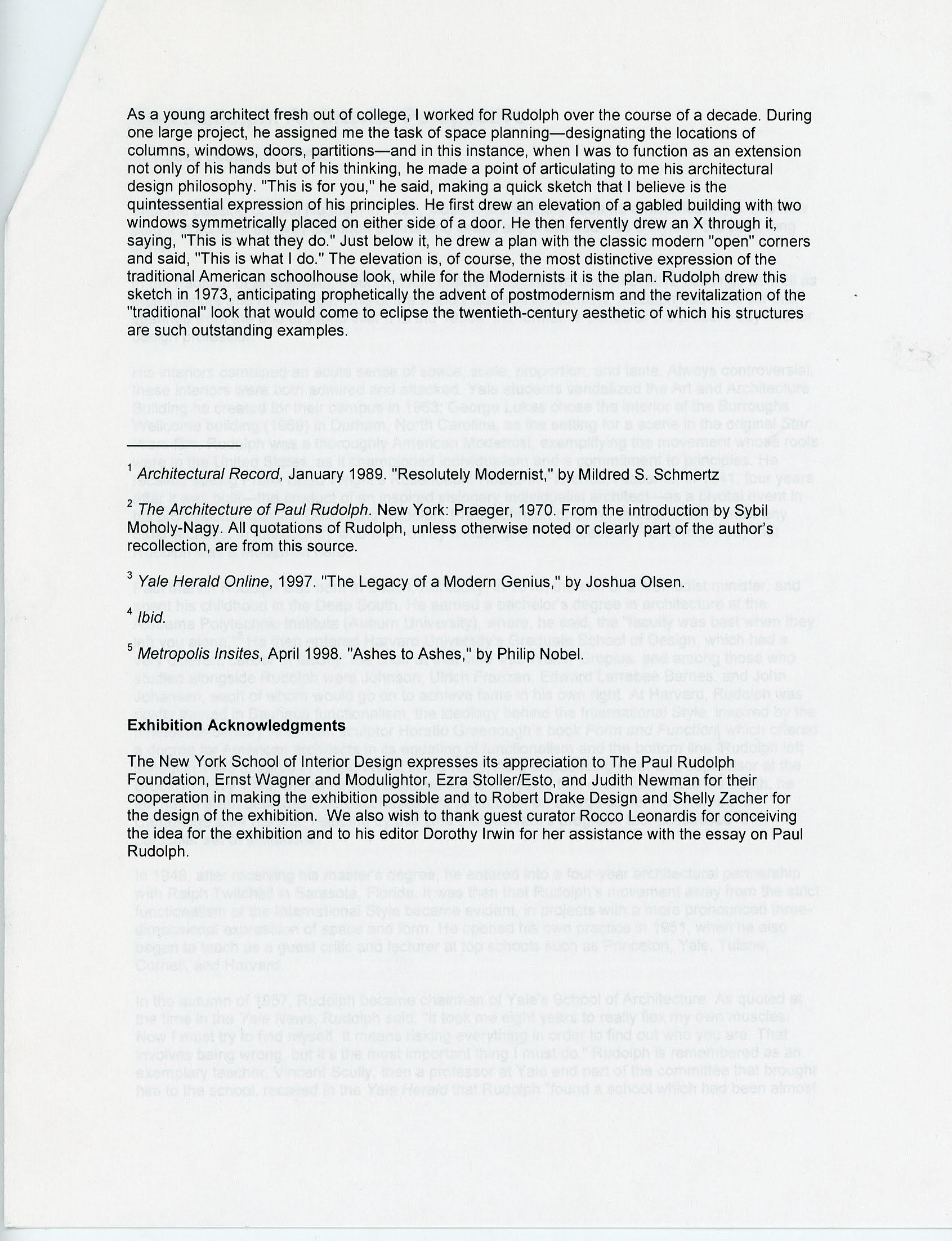 The New York School of Interior Design expresses its appreciation to The Paul Rudolph Foundation, Ernst Wagner and Modulightor, Ezra Stoller/Esto, and Judith Newman for their cooperation in making the exhibition possible and to Robert Drake Design and Shelly Zacher for the design of the exhibition. We also wish to thank guest curator Rocco Leonardis for conceiving the idea for the exhibition and to his editor Dorothy Irwin for her assistance with the essay on Paul Rudolph.