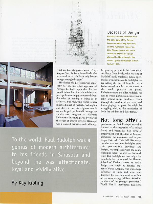 For three years he was stationed at Brooklyn Naval Yard (where he first saw a plastic roofing film material sprayed on mothballed ships, a tool he later employed in the famous Cocoon House on Siesta Key. Here, also, he presumably contracted the asbestos-related form of cancer that later led to his death). When the war was over and his term of service ended, Rudolph returned first to Harvard to complete his master's degree; then to the New Pass studio of Ralph Twitchell, where together the two would collaborate on some quintessential Sarasota School of Architecture designs.