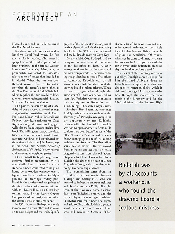 That commission came about, in part, due to a chance meeting between Rudolph and Shirley Hiss, who was married to influential amateur architect and Renaissance man Philip Hiss. She lived at the time in a home on New Pass, near Twitchell's studio, and the two met by accident and got to talking. "I invited Paul for dinner one night, and said to Phil, 'I think this is a person you'd be interested in,'" recalls Hiss, who still resides in Sarasota. "They shared a lot of the same ideas and attitudes toward architecture-the whole idea of indoor/outdoor living, the walls of glass, the ventilation. Of course, whenever he came to dinner, he always had to leave by 11, to go back to drafting. He was totally dedicated; I think he slept under that drafting board."
