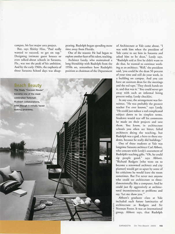 One of those students at Yale was longtime Sarasota architect Carl Abbott, who concurs with Leedy's assessment of Rudolph's teaching gifts. "Oh, he could rip people good," says Abbott. "Richard Rodgers [who went on to become a renowned architect and city planner] would get so upset by some of his criticisms he would leave the room sometimes. But I've never met anyone who could see architecture so three-dimensionally, like a computer. And he could just fly aggressively at architectural inconsistencies or problems and say, 'Let me show you.'"